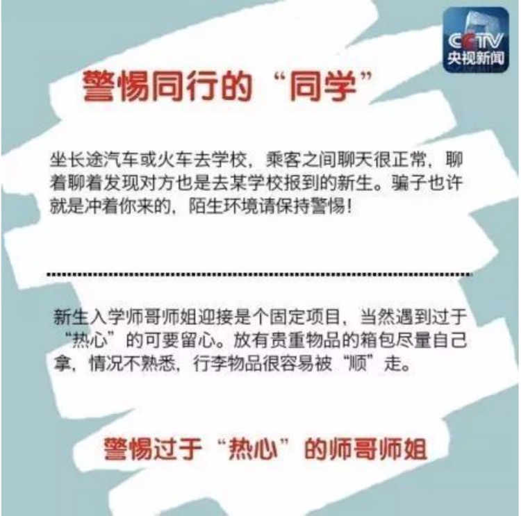每年新生报道时,人员流动较大,是诈骗案件的高发时期。冒充新生接待员,拎走行李一去不回;帮忙代缴学费,拿走钱后不知去向;冒充老师和学生干部,进入新生寝室收取各种费用……如何甄别诈骗伎俩,平安开始新生活?擦亮双眼,提高警惕