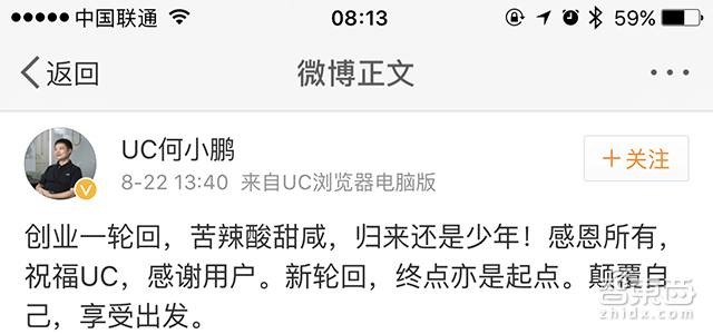 “创业一轮回,苦辣酸甜咸,归来还是少年!感恩所有,祝福UC,感谢用户。新轮回,终点亦是起点。颠覆自己,享受出发。”8月22日是UC成立的第13个年头,何小鹏却在自己的微博上写下了上述“鸡汤”,宣布自己正式离职,雷军、姚劲波等大佬也在评论区留言力挺何小鹏。