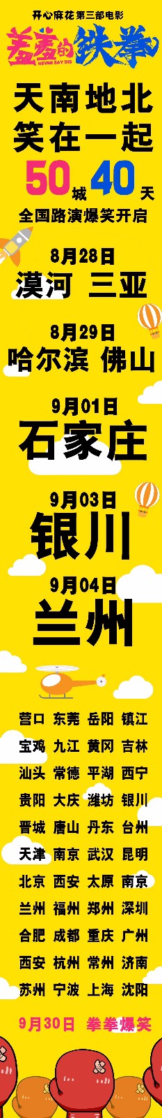 这还不够,要想更大程度地吸引观众对影片的关注,《羞羞的铁拳》延续了《夏洛特烦恼》的路演模式,提前40天在各大城市展开密集式地笑点轰炸。而从《夏洛特烦恼》的20城路演扩大至更多城市,并且成为史上最北和最南,如此规模和周期,显然《羞羞的铁拳》是铁了心要在国庆档大干一场了。