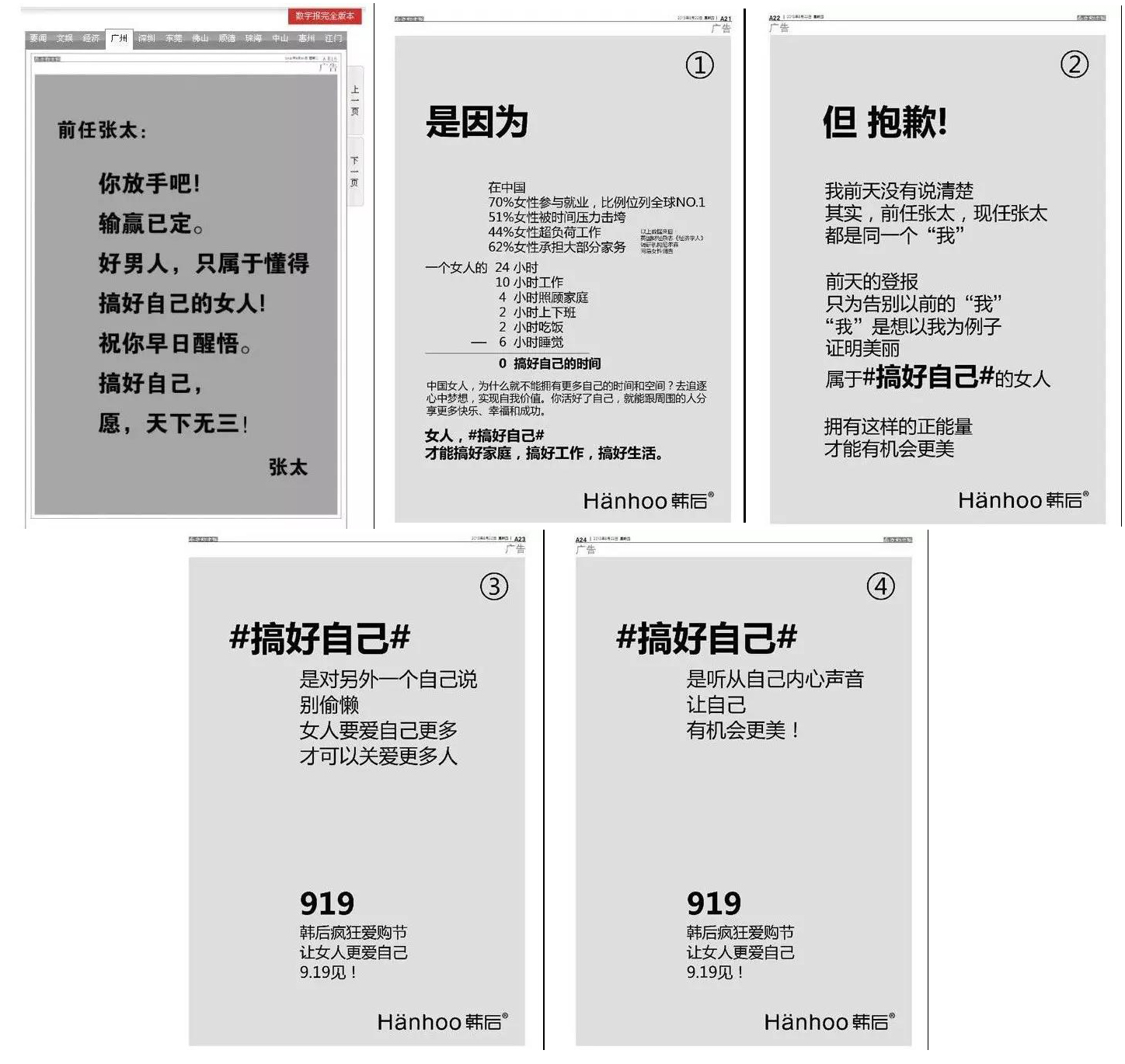 2013年,韩后买下《南方都市报》整个版面的张太系列广告创意引发全社会的关注。每年的919品牌活动日依靠全渠道的传播和销售,销售额在2015年就已经达到10亿。韩后的营销历来是业界关注、模仿的对象。
