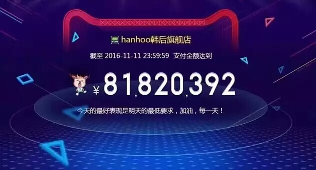 去年超越这个数字同样非常迅速,54分钟,这对第二次参加“双十一”的韩后来说是一个巨大的鼓励。