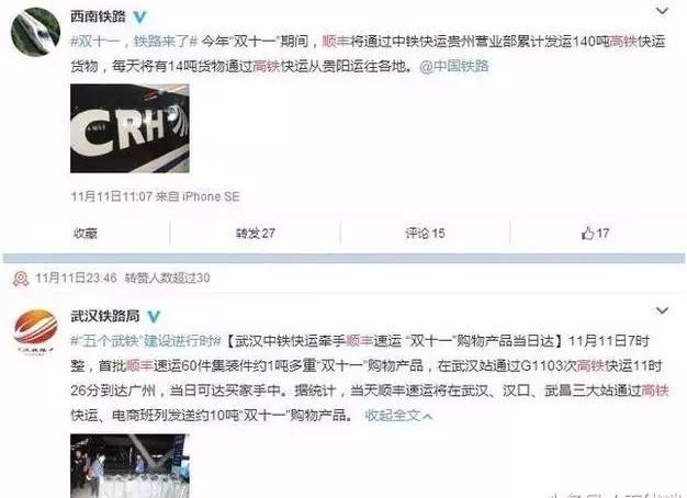 去年“双11”期间,有关的铁路部门发微博晒出“双11”货运成绩单,爆出顺丰“包下”部分高铁送包裹的消息——