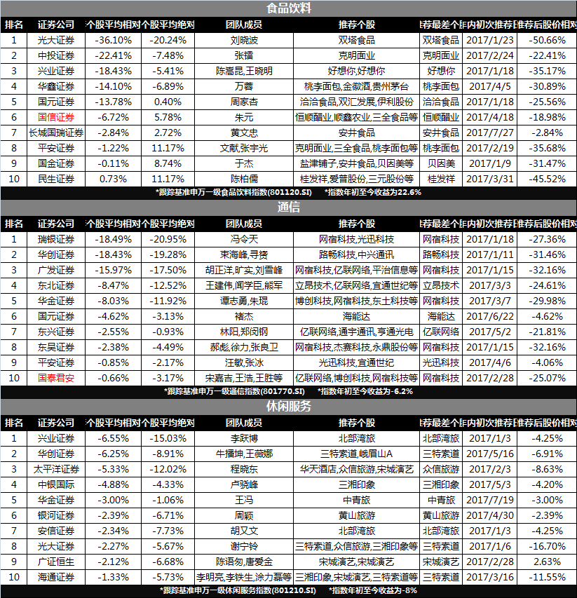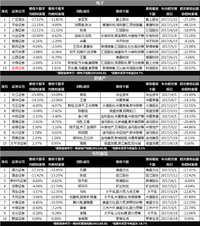 排在榜单第三位的是安信证券,今年以来买入评级研报涉及申万一级行业26个,今年初至8月20日整体绝对收益为-0.35%,相对收益为0.69%。以相对收益衡量,表现最不好的行业为家用电器,其相对收益为-10.81%、绝对收益为-7.36%。胡又文、王书伟、张立聪等为该行业团队成员,推荐最差个股为奥马电器(002668.SZ),该股最早推荐时点为2月24日。
