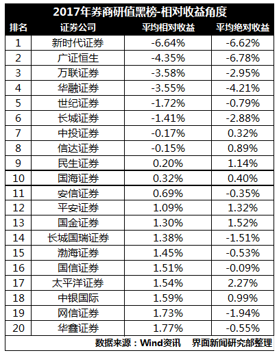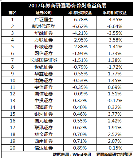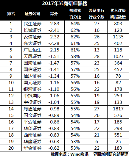 在界面新闻制作的券商黑榜中,民生、长城和安信证券三家券商研究所位列前三 。