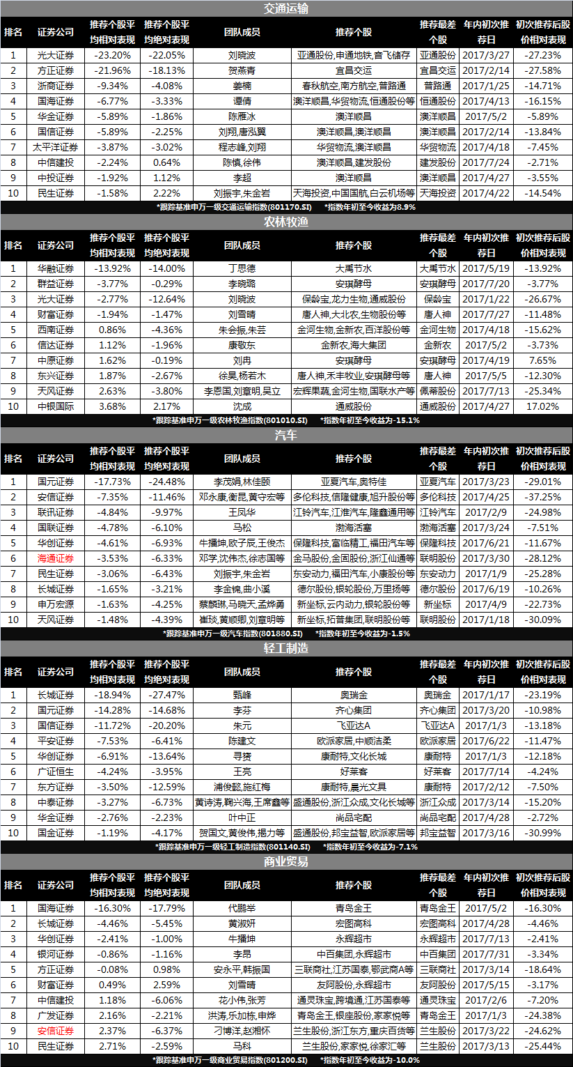 此外,部分券商的收益数据表现并不弱但总得分较低,主要有两个原因,一个是券商黑榜排名是为了综合分析研究所在各行业的表现情况、基于行业同权重的情况下考虑,所以一个行业的突出表现并不能从收益角度完全覆盖其他行业的表现不足。另一个原因是总得分包括各行业内券商的相对关系以及券商绝对收益与行业指数相对关系两个相对的概念,所以排名与绝对收益之间并不是直接吻合的。