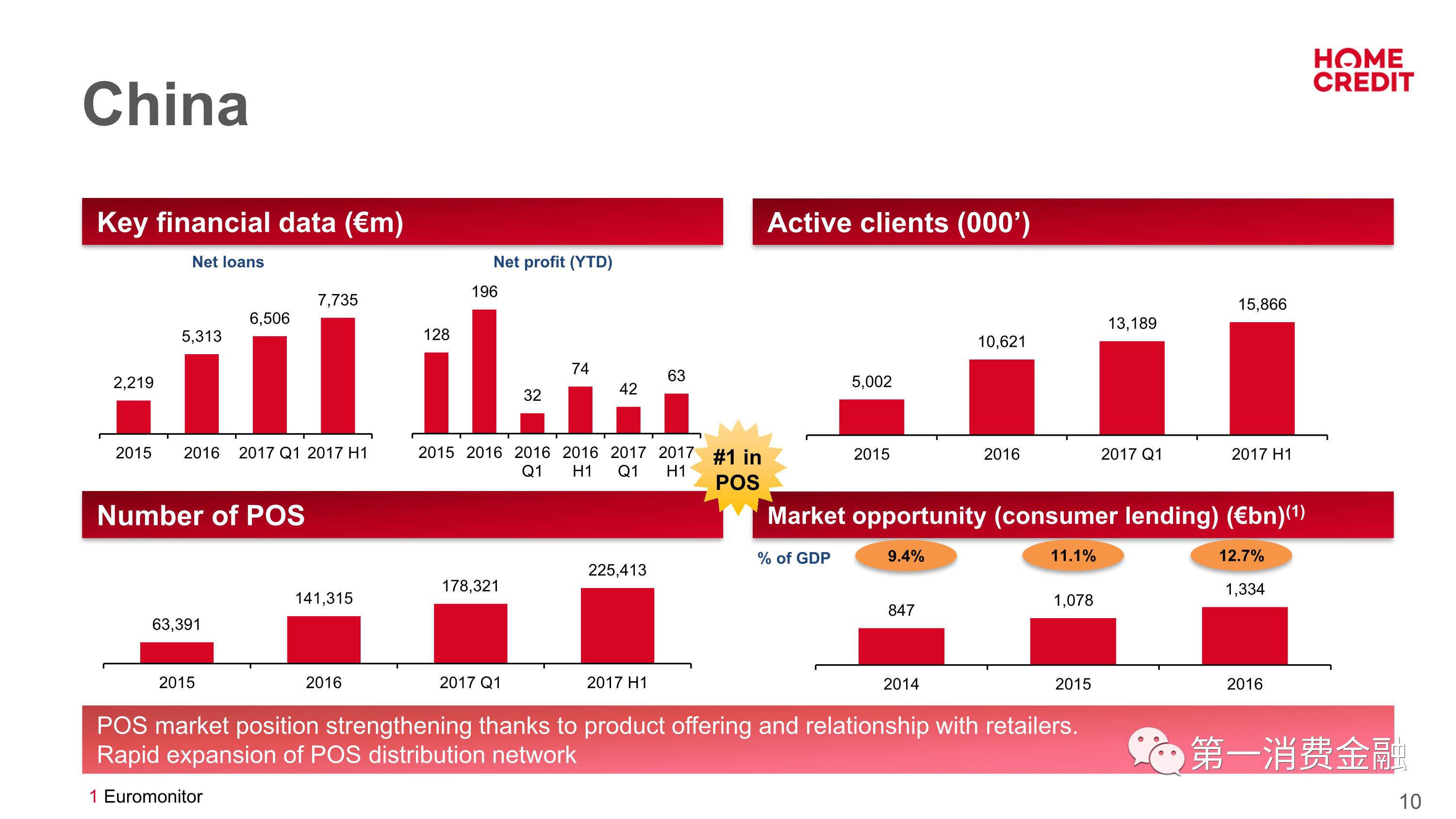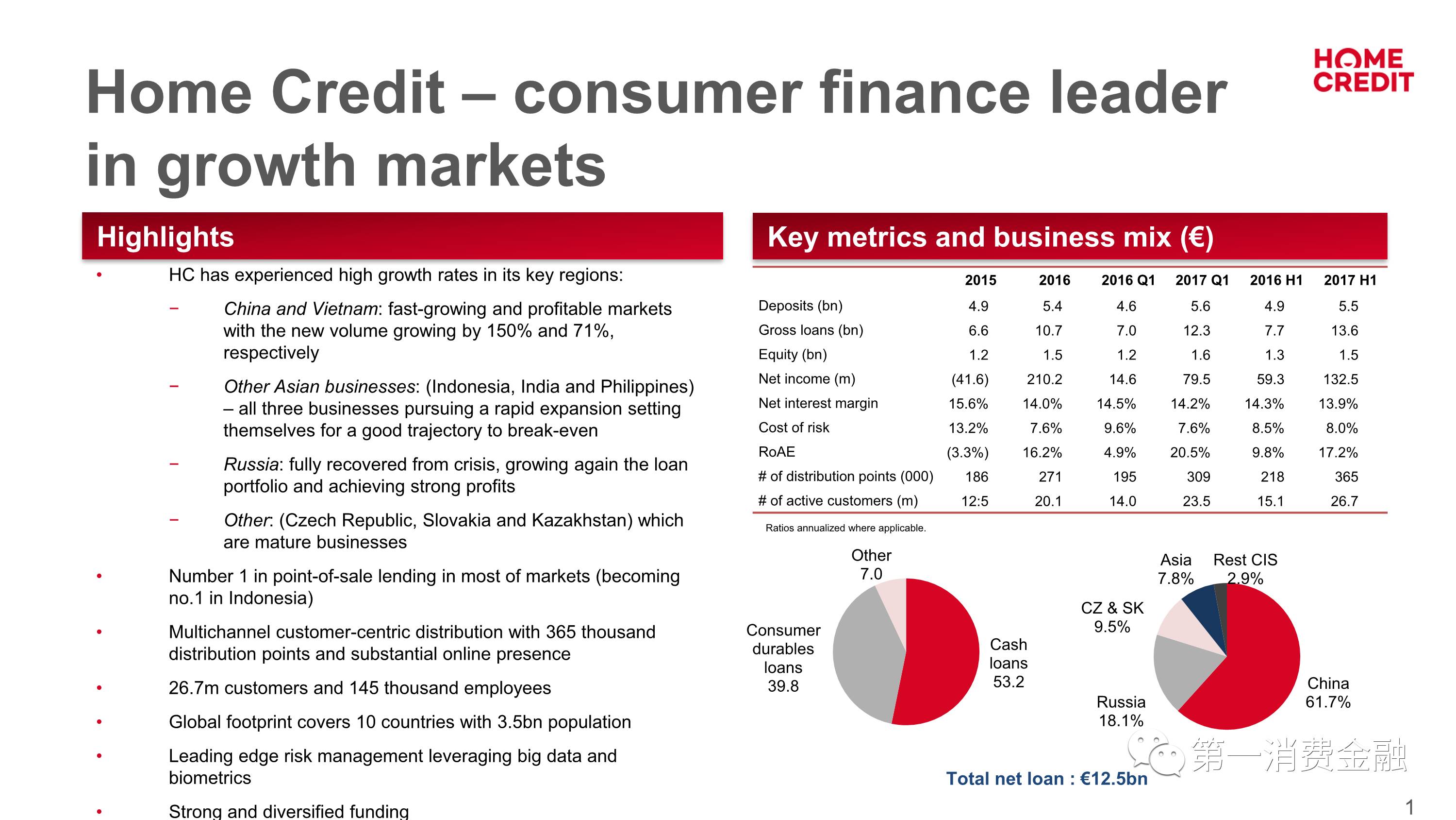 2017H1,捷信的125亿欧元净贷款额,如果按照国家划分,中国占比为61.7%,俄罗斯占比为18.1%,捷克和斯洛伐克占比为9.5%,亚洲(第一消费金融注:捷克的财报中亚洲不包含中国,一般指印度、印度尼西亚、菲律宾等等国家)占比为7.8%,其他主权国家占比为2.9%。