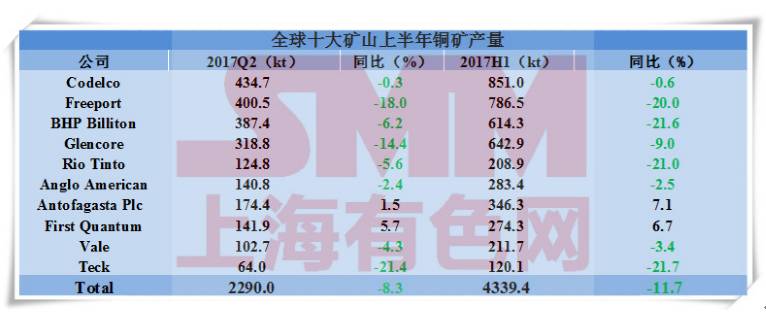 2017年业已过半,各大矿企悉数公布上半年财报,相较于一季度频繁的罢工扰动,致使主要铜矿产出下滑逾10%。进入二季度,结束罢工后铜矿产出呈现恢复性增长,SMM统计前十大主要矿企同比降幅收窄至8.3%。今年上半年十大矿山铜矿产量同比下滑约11.7%。