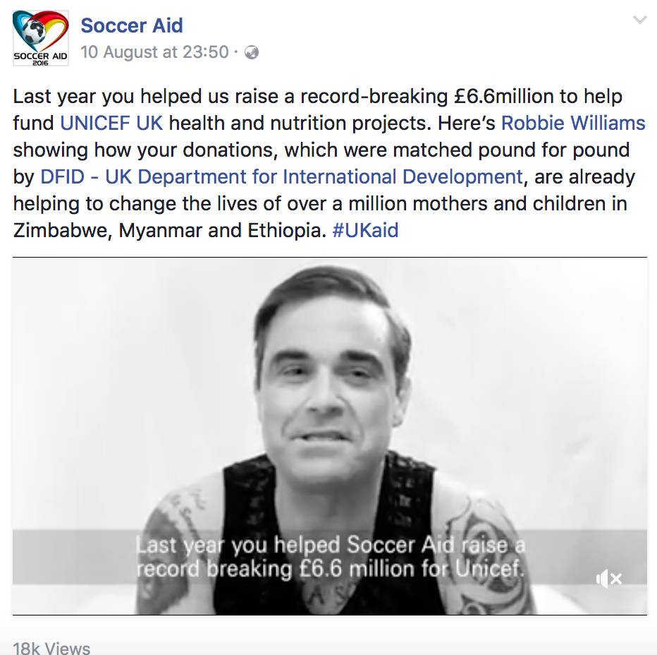 而由英国巨星罗比·威廉姆斯(Robbie Williams)例行发起的“Soccer Aid”也是知名的足球慈善赛。比赛一般安排在曼联主场老特拉福德举行。参赛球员往往来自娱乐界名人及足球名宿,其中一队代表英格兰,而另一队则为世界明星队。
