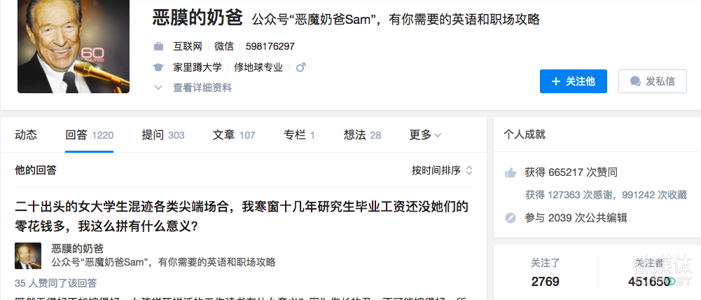 该用户是典型的知乎“超级大V”,目前拥有45万粉丝,一共获得了66.5万次赞同。