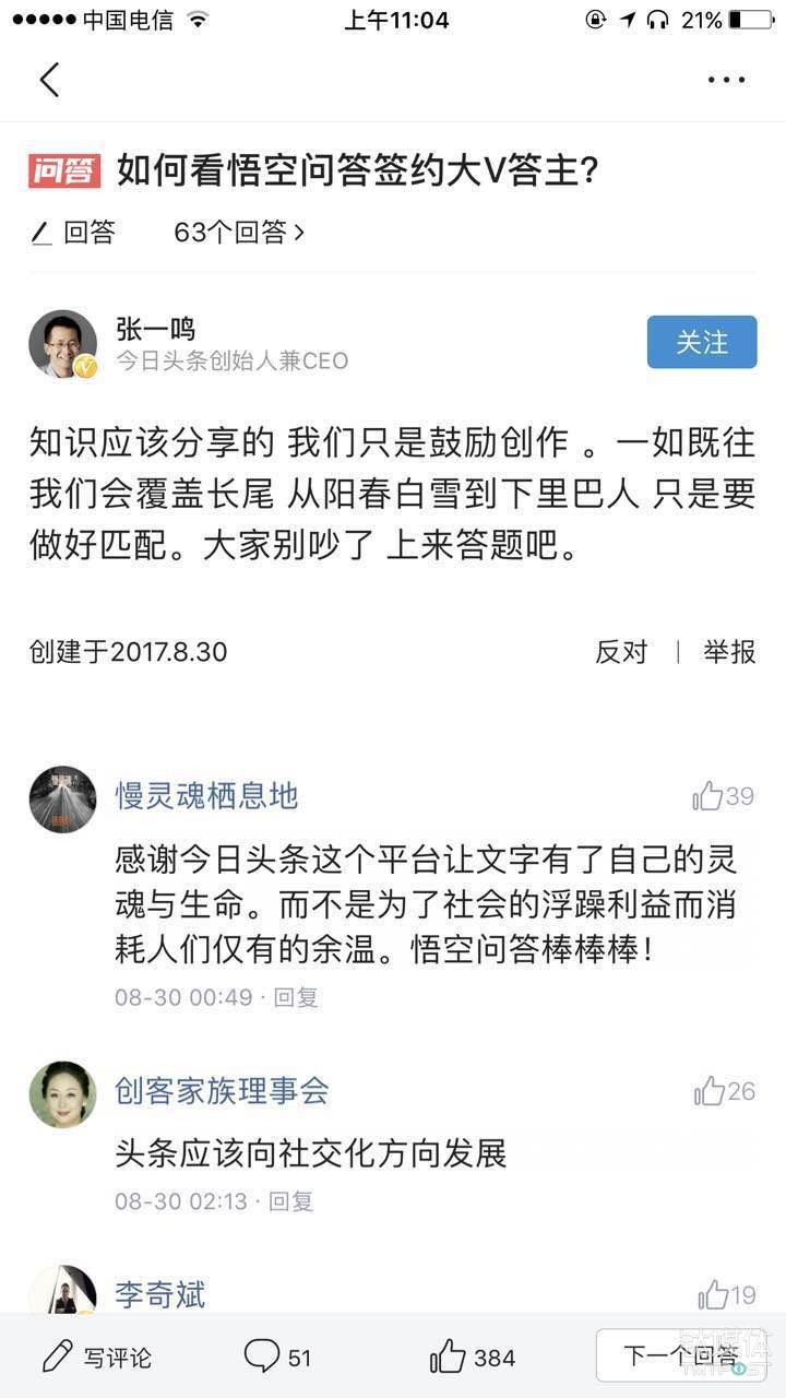 针对热议,今日头条创始人、CEO张一鸣在昨日晚间做出了回应,称“知识应该分享,我们只是鼓励创作”。张一鸣的回应,恰恰是通过“悟空问答”发出。在“如何看悟空问答签约大V答主”的问题下,张一鸣用个人账号做出了回应: