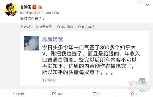 昨日(8月29日),微博上传出一张知乎大V“恶魔奶爸”的朋友圈截图。该条朋友圈称,“今日头条今年一口气签了300多个知乎大V并提供比普通白领更高的年收入,但签完后所有内容不可再发知乎。”