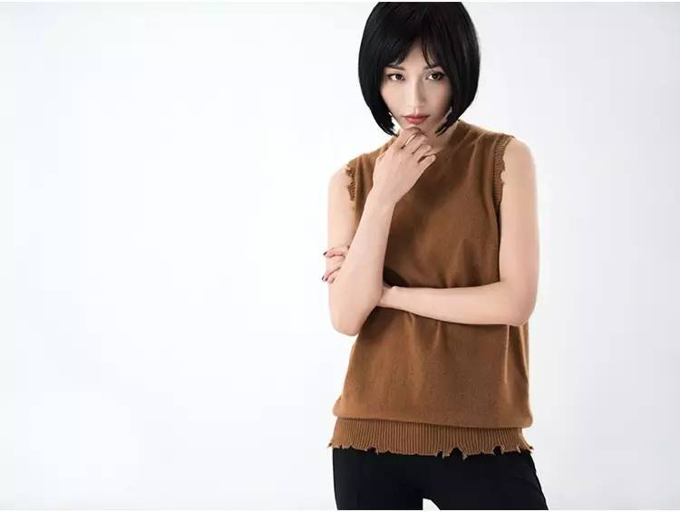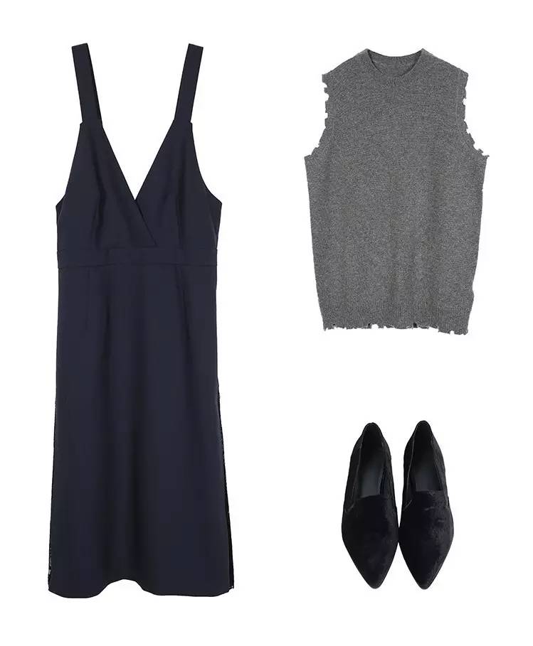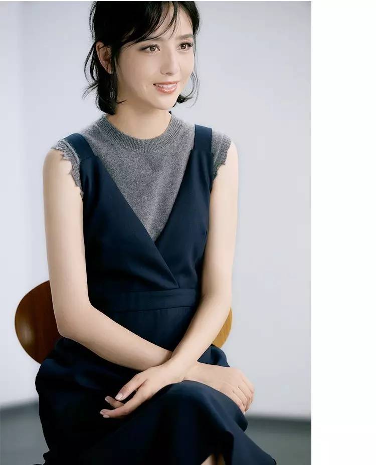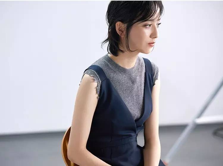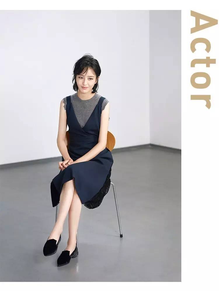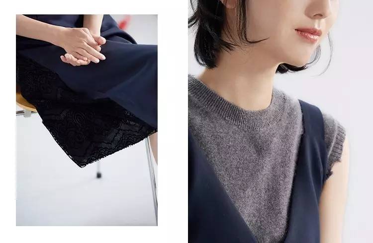 拍摄完工后,我们抓紧时间聊了会天。靠在椅子上的丫丫,烟灰色羊绒背心外搭了条藏青色V领连衣裙,勾勒出纤细的腿部线条。知性简洁的色调比例考究。在毛衫柔软质地的包裹下,她也显得放松起来。