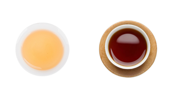 从茶汤和滋味上来说,熟茶汤色为红褐色,生茶汤色较浅,呈黄绿色(不包含老茶)。生茶口感较绿茶来得浓强,易出苦味,熟茶口感似红茶般醇厚、浓郁、温和。
