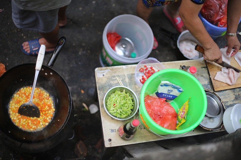 家属们在便民灶上翻炒饭菜。灶的主人万佐成能从食材判断他们的亲人还能活多久:如果淡菜清汤突然换成肉荤,通常意味着病人命不久矣。