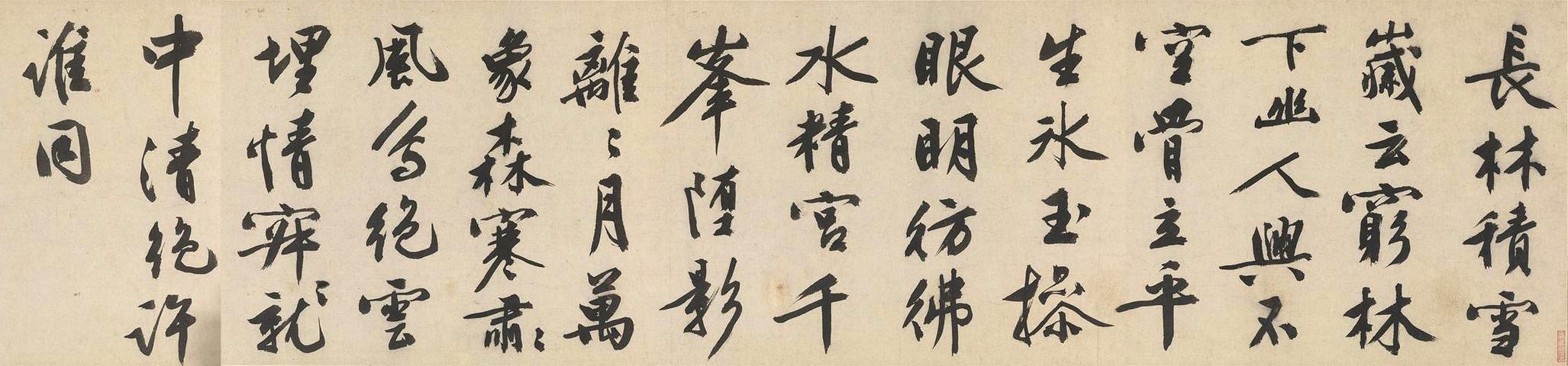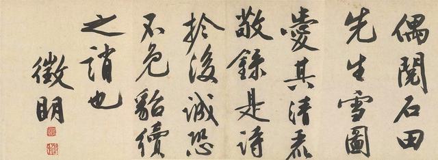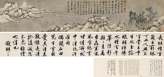 此卷绘雪景,起首处为丛岩杂树数株,更见萧疏之致,过石桥可见人家,屋后山崖多点矾头,矮树斜出,更可见宋人遗意。湖中有一渔翁垂钓,颇有“孤舟蓑笠翁,独钓寒山雪”的感觉。画卷收尾处为远山,勾轮廓而辅以皴法,再以浓墨加矾点,得幽静凝重之境。吴湖帆评为“石翁宗法董、巨、痴翁、梅沙弥,为南宗嫡派,然于希古、马、夏工力至深,又可为北宗骄子,故一点一画间无不浑厚锋棱兼具。”沈周画后,为文徴明大字题诗一首,征明因“偶阅石田先生雪图,爱其清丽”而书,乃晚年力作,老笔漫写,古朴而跌宕有神。