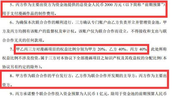 腾讯、啊哈动漫、三五互联三方对漫画项目的权益比例分别为20%、40%、40%,权益比例不涉及投资,属于三方对全部漫画项目知识产权及其收益权的分配比例。