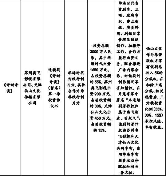 从文件表格中可以看到,这部网剧的投资总额3000万中,华海时代出资1650万元,占投资总额的55%,苏州奥飞影视出资900万元,占总投资额的30%,天津仙山文化出资450万元, 占总投资额的15%。