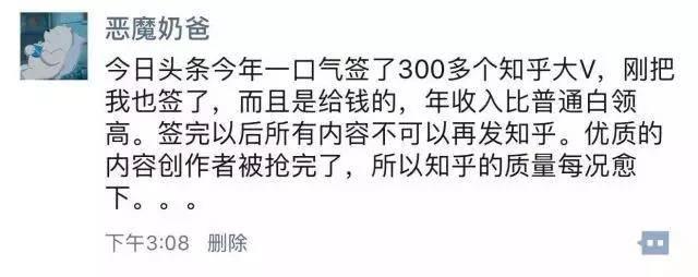 今日头条又双叒叕再度登上了头条!8月29日,网络上一张截图迅速流传开来,引起了千重浪,大意是:今日头条签约了300余名知乎大V,而且收入比普通白领还高,但是签约之后内容不可以再发到知乎上,这也将意味着知乎丧失了优质的内容创作者,将面临每况愈下的境地。