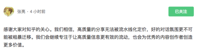 最后,知乎强调,“无论从站内氛围还是后台数据来看,该事件并没有对我们产生影响,优质内容生产者依旧在持续生产和分享优质内容。”同时,张亮亦在知乎新版块“想法”上表示:“高质量的分享无法被流水线化定价,好的对话氛围更不可能被粗暴迁移。我们会继续专注于让高质量信息更有效的流动,也会为优秀的内容创造者创作更多的价值”。