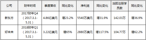 同期,新东方2017财年第四季度的营收为4.86亿美元,净利润为5540亿美元,基数均高于好未来,同比增速分别为23.2%和31.9%,增长的动能则低于好未来。