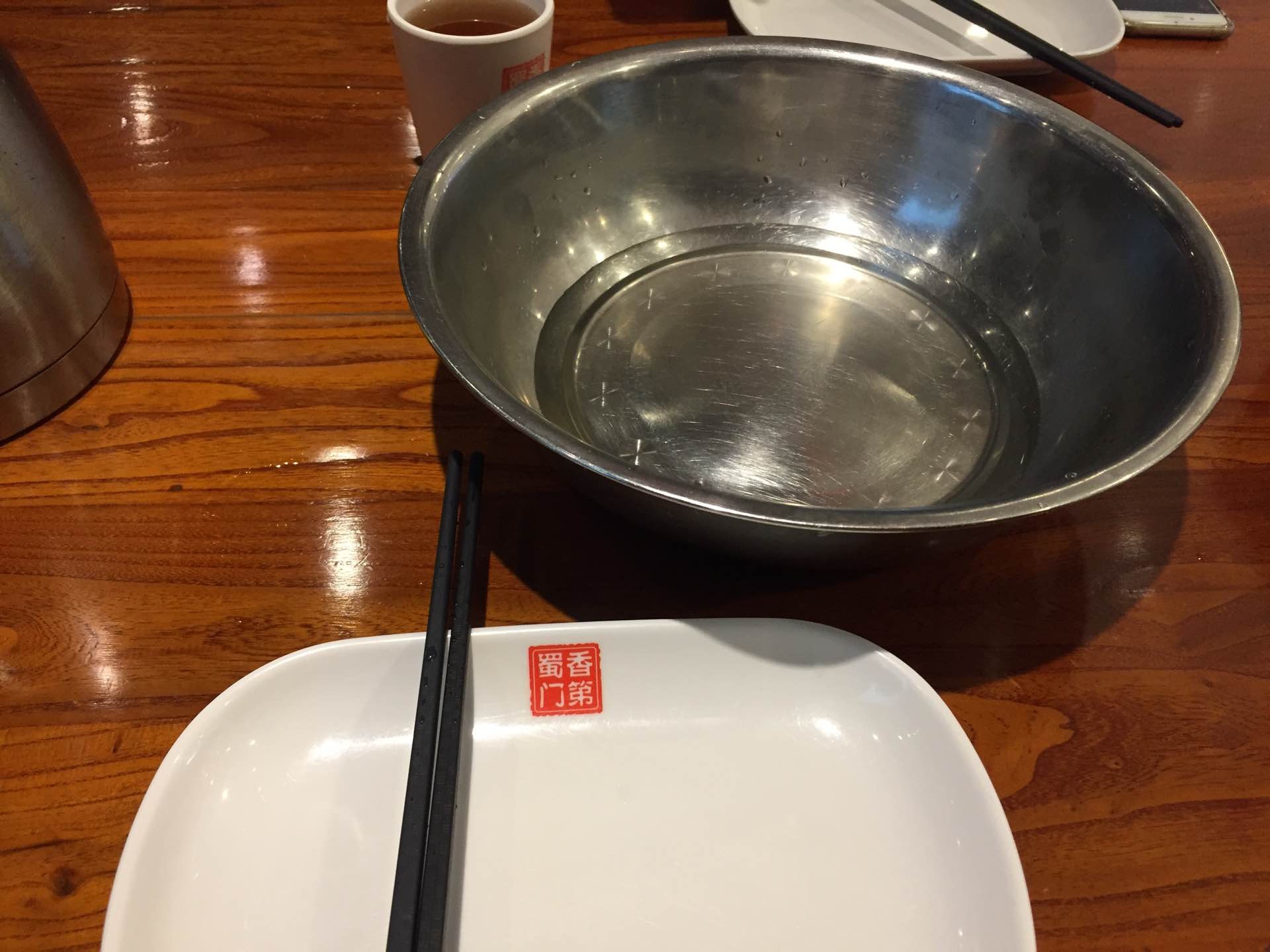 这样一个很细微的服务让吃饭的人很温暖。我相信很多朋友在饭店吃饭都有用热水烫餐具的习惯,但是能够拿来不锈钢盆方便顾客的只有这家餐饮。这家店的名字叫:蜀香门第。