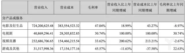 其中最为典型的莫过于完美世界,其2017年上半年公司营收35.88亿元,较上年同比增长69.68%,其中游戏业务收入高达30.7亿元。2017年上半年营业成本为15.78亿元,营业成本主要包括代理游戏分成、渠道分成、IP分成、影视剧制作成本以及院线业务成本等。而在影视业务方面,完美世界上半年主要依靠《非凡任务》、《深海利剑》等电影电视剧作品,实现了1.26亿元的营收,加上院线业务收入3.92亿元,整体实现收入达5.18亿元,较上年同比增长94.45%。