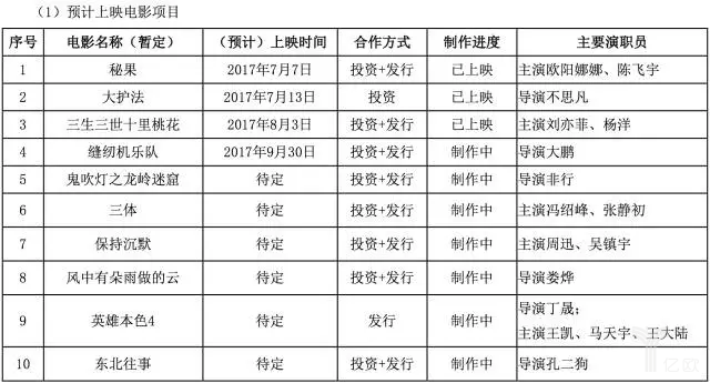 在公司业务方面,电影业务中,报告期内公司参与投资、发行并计入本报告期票房的影片共七部,总票房为13.83亿元,其中,《大闹天竺》《嫌疑人X的献身》《春娇救志明》《重返·狼群》《缉枪》五部影片已在报告期内上映。