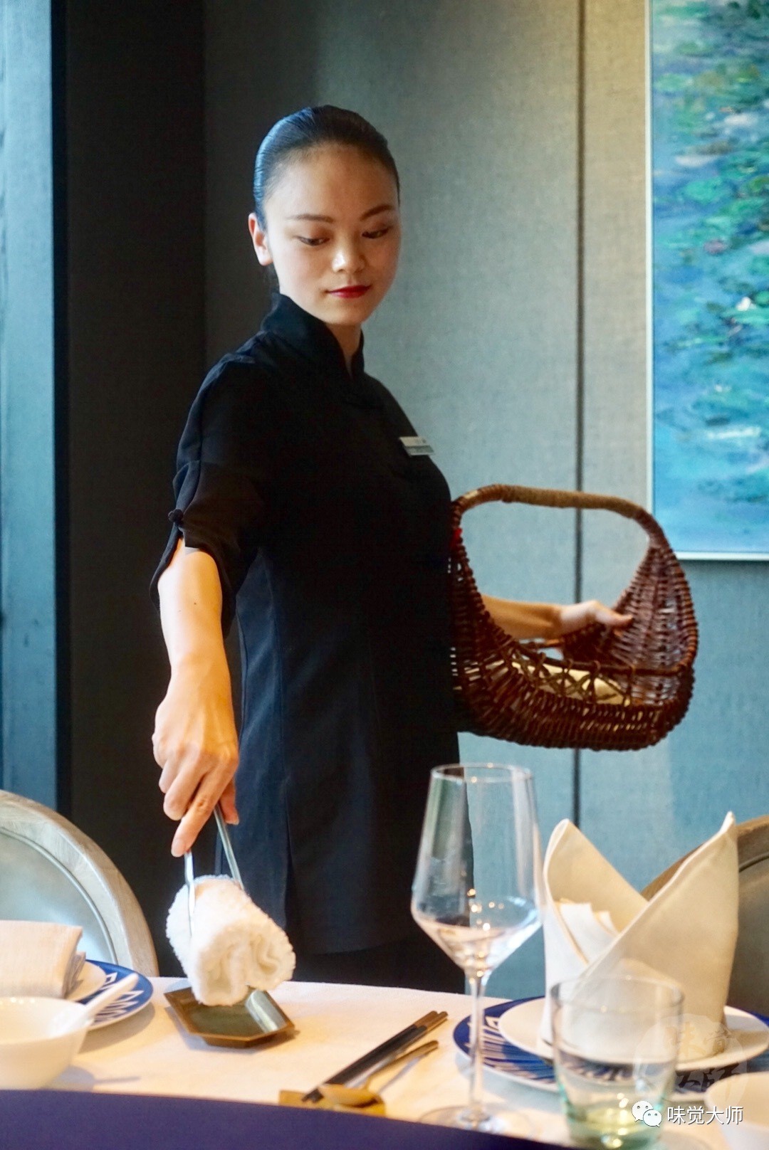 在新荣记,服务生展示黑松露手势优雅,刨刀速度利落,菌片薄且香;伊比利亚火腿有专人现场片,单片大小恰当,部位均匀;这间中餐厅的芥末是用日本山葵,每日以鲨鱼鳍板研磨,新鲜呈客;客人外带酒品,服务生会选不同杯形侍酒。中西餐用餐、新食材使用,服务生都有相应课程,练习实践。