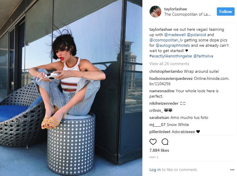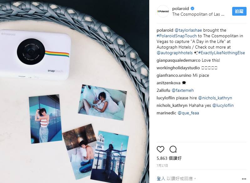 譬如,与KOL Taylor LaShae的合作,她在Instagram上有17万粉丝,风格主打70年代复古元素,与Polaroid有机结合在一起——因为照片在拉斯维加斯拍摄,甚至被当地某机构官方Instagram账号转载增加曝光——cosmopolitan_lv:Love this photo! We'd like to potentially feature it on our social channels.