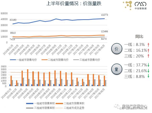 上半年一线、二线、三线城市价格都在轻微上浮,同比温和上涨,而2016年的上涨是非常高的。再来看成交量,一线城市成交量下降幅度很大,接近38%,二线下降了21.6%,三线下降了8.8%,总体特征就是价涨量跌。