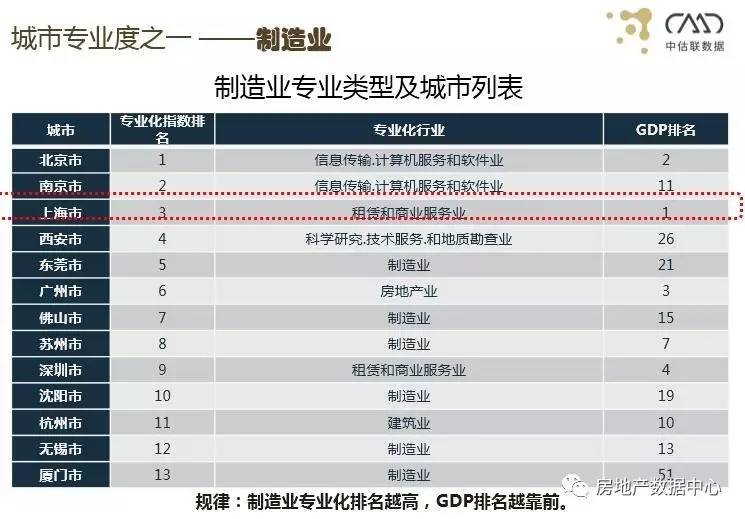 先看一个大类——制造业,我们发现一个城市做什么以及产生的效果跟GDP的排名很有关系。比如说上海市,它的GDP排名是第一,它优势、专业度最高的产业是租赁和商服,而北京是IT,深圳和上海类似。所以这里有一个总体规律也是我们第一个研究结果:制造业专业化的排名越高,GDP就越靠前。