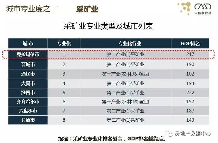 第二个研究发现。有一类城市的采矿业和农业的专业化程度非常高,比如说克拉玛依市,它在整个全球GDP排名是第217名,但它采矿业的专业化程度排在第一,所以采矿业专业化排名越高,GDP排名越靠后。