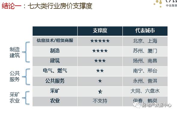 还有建筑类、电气燃气类、公共服务类,这一类我解释一下,有些城市制造业不是很发达,但是它教育类、医疗类资源比较丰富,比如地级市有相对集中的医疗和教育资源,那么房价也会有一定支撑。对房价来讲,支撑度相对差的就是采矿和农业。
