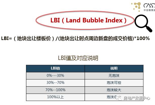 LBI是中估联的特色指标,Land BubbleIndex,它的公式是用地块出让楼板价除以地块出让时点周边新盘的成交价格,我们通过对大数据的分析得出了一个基本合理的值,以及它对应的说明。LBI值在30%以内我们认为地块泡沫比较小,30%-70%之间泡沫可控,一旦大于70%这个泡沫就比较大,如果超过100%,泡沫就很大了。