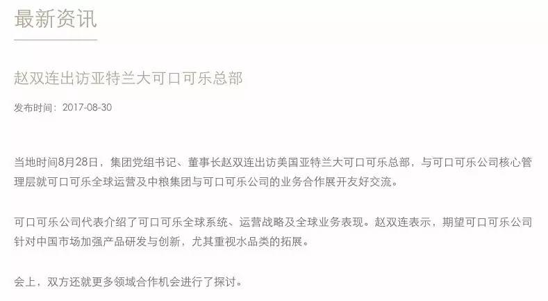 据介绍,中粮董事长赵双连日前出访美国亚特兰大可口可乐总部,并提出期望可口可乐公司针对中国市场加强产品研发与创新,尤其重视水品类的拓展。