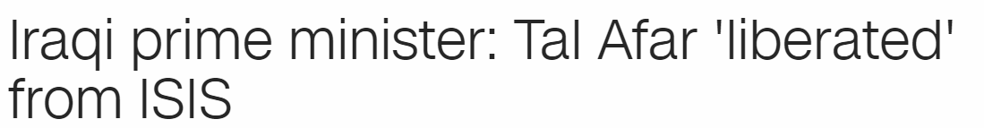 【伊拉克总理宣布阿法尔市解放】伊拉克首相阿巴迪周四在一份声明中说,政府军已经解放了被ISIS控制的战略重镇泰勒阿费尔市,整个尼尼微省已解放。阿费尔市是ISIS在尼尼微省控制的最后一个市,距离早前被收复的摩苏尔45公里,自2014年6月被ISIS占领。美国领导的反ISIS联盟部队也在周四发表了声明,祝贺伊拉克政府和人民取得的这一重大胜利。