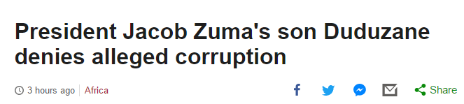 【南非总统祖马的儿子否认腐败指控】南非总统祖马的儿子Duduzane在接受英国广播公司的独家采访时表示,尽管自己与Gupta家族有联系,但是自己并没有参与到任何的腐败活动中来。他称自己与商业伙伴的联系“没有什么不好的”,并称“不认为他们想要任何东西”,他们只是喜欢自己这个人。