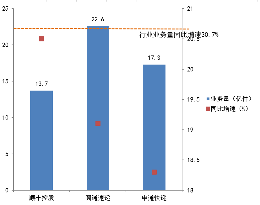 上图显示,今年上半年,尽管顺丰控股、圆通速递、申通快递分别实现业务量约13.7亿件、22.6亿件、17.3亿件,但同比增速却低于行业增速。其中,申通快递业务量增速偏低,同比增长率仅18.3%。