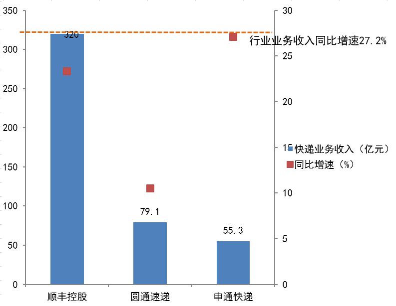 而在快递业务收入方面,顺丰控股、圆通速递、申通快递分别实现320亿元、79.1亿元、55.3亿元,同比增速同样低于行业水平。其中,圆通速递增速偏低,同比增长率仅10.5%。