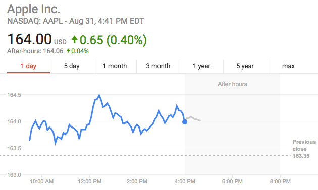 今日,苹果公司股价收涨0.4%,至164美元。