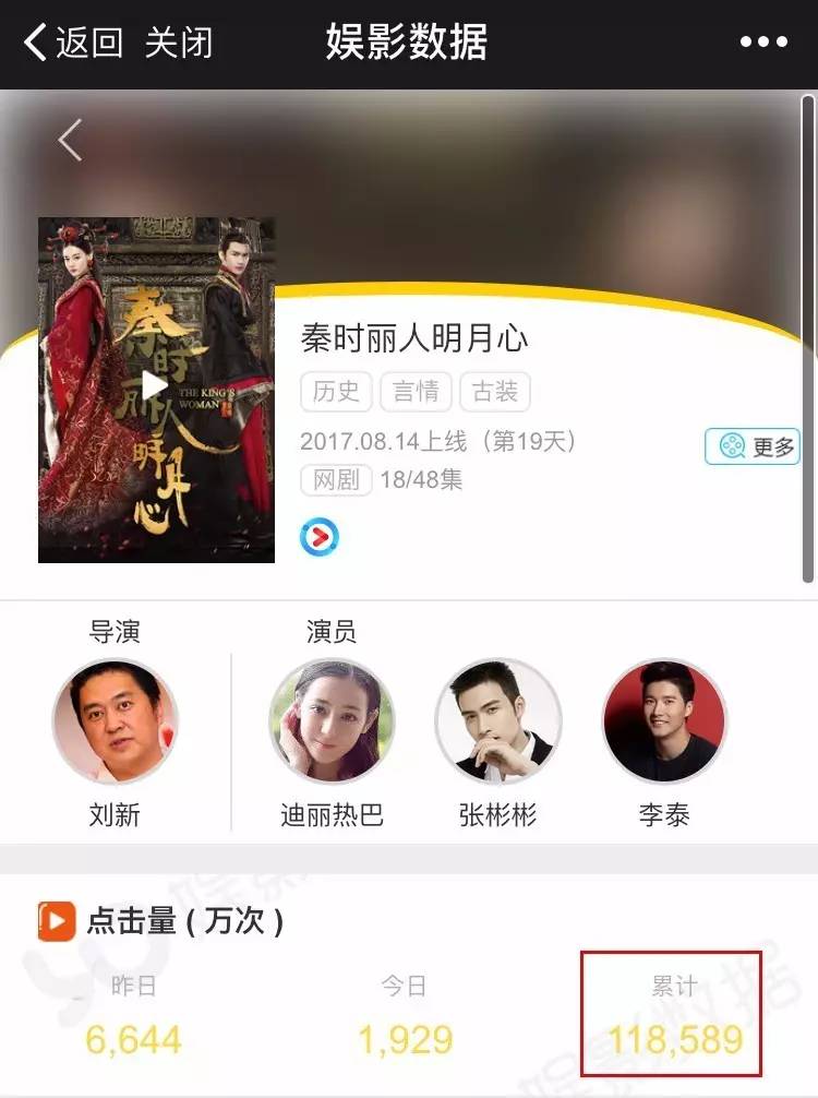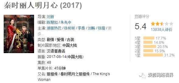 2017年最火的小花非迪丽热巴莫属了,从年初到现在热播剧不断,而且还参加了综艺《奔跑吧》,可谓是虏获了不少的迷弟迷妹啊。在今年年初与当红小生张彬彬共同合作了两部戏《漂亮的李慧珍》、《三生三世十里桃花》,现如今两人再度合作,出演史诗大戏《秦时丽人明月心》。目前在浙江卫视和优酷视频联合播出,至今已播出18集,豆瓣评分也是没及格,累计点击量突破11.8亿。