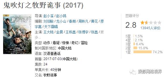 而与口碑、播放量双丰收的《河神》相比,在口碑上更是惨不忍睹,《河神》豆瓣评分8.4分,《黄皮子坟》却只有2.8分,是《鬼吹灯》系列作品评分最低的。