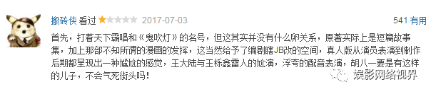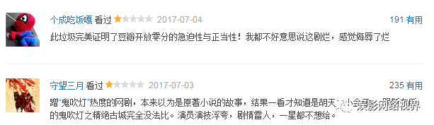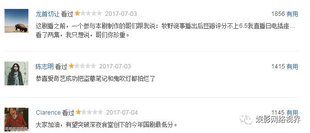 这部剧主要是天下霸唱的零散笔记小说集,主要讲述传承古代探墓绝技的“摸金二代们”带着家传技术与神秘女子冰轮一起进入千年古墓,寻找父辈下落的冒险故事。所以除了名字相同、题材类似,基本就是一部与“鬼吹灯”没有什么关系的作品。被网友骂得惨不忍睹,给大家看一下豆瓣众多一星的评论。