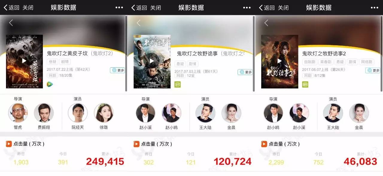 而对于王大陆首次出演的网剧《鬼吹灯之牧野诡事》虽然两季的累计播放了已经突破了16亿,但与最近上线、同为悬疑盗墓题材的《鬼吹灯之黄皮子坟》的24亿播放量相比实在是有些差距。