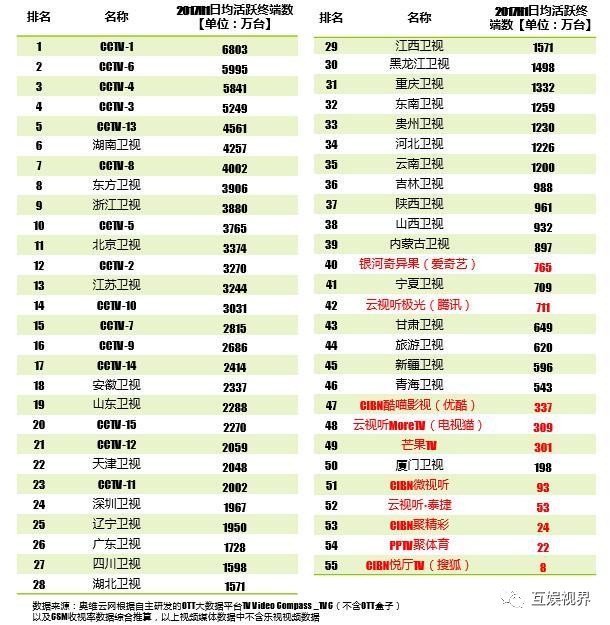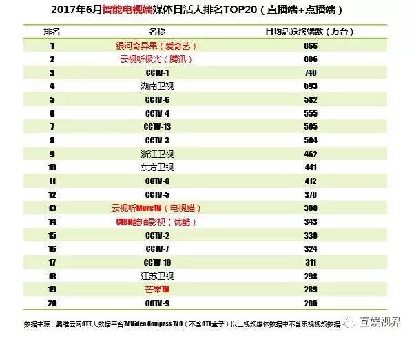 智能电视端:银河奇异果、云视听极光的日活规模均超过直播端最强频道CCTV-1