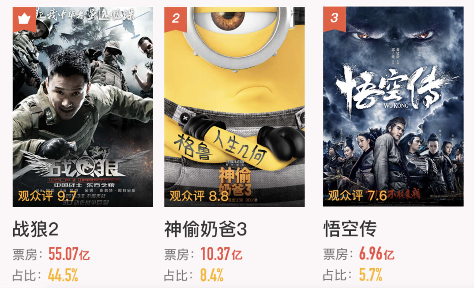 然而在《战狼2》以摧枯拉朽之势收割票房创造纪录的时候,暑期档另外84部新片的日子就没那么好过了。《战狼2》之外唯一一部票房突破十亿的则是七月初上映的《神偷奶爸3》,尽管好莱坞动画电影在整个暑期档几乎只有这一部主力作品,但依然对大量希望在暑期档分得一杯羹的国产动画电影形成了碾压。7、8月两月上映的共9部国产动画电影,仅有《十万个冷笑2》最终勉强过亿,9部票房总和最终不及《神偷奶爸3》,让国产动画电影的处境极为尴尬。