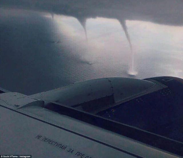 8月29日,一架客机接近龙卷风生成的空域,一连3个龙卷风卷横亘海天之间,狂风肆虐,天地变色,恍如好莱坞灾难片。飞行员没有返航或者迫降,而是直接从龙卷风旁镇定擦肩飞过。据报道,事发当天一共在索契外海目击到12个龙卷风形成。据索契机场消息,当时未发生任何紧急情况,飞机成功着陆。