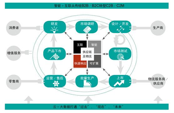 第一层:基于新零售等新商业模式,从前端(销售)出发重新梳理后端供应链,打通产品、渠道、流程,从B2B/B2C转向C2B/C2M;