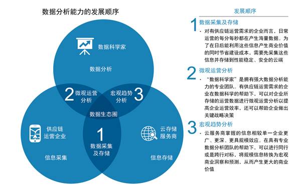 然而,罗马建成非一日之功,企业需要从根本做起,遵循数据分析能力的发展顺序。从数据采集、存储到内部微观运营分析,再到跨企业、跨行业的宏观趋势分析,建立起明确的战略计划及实现路径,并有主次、有目标地贯彻执行,才能奠定供应链及物流智能化的基础。