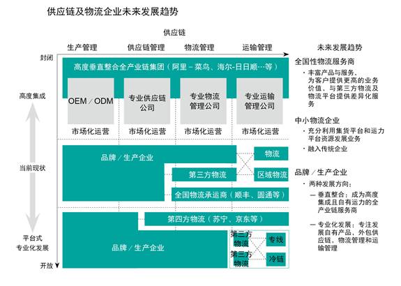 未来,物流生态将由较为零散的独立运营企业,逐渐向专业化及平台化发展,原有的全国综合物流服务商将承载更全面的产品及服务;而中小物流企业则依托平台实现专业化发展;品牌/生产企业则将朝更加垂直整合或聚焦销售与品牌的轻资产模式发展。